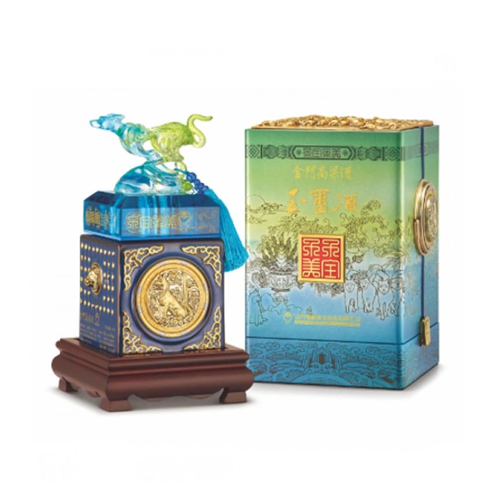 本產品乃金門酒廠2015年首度發行的系列性十二生肖玉璽酒之一,玉璽代表著一國領導者行使權利的權杖,有著至高無上的權力與無比尊貴之特質鑒此,金門酒廠特別精心結合中國十二生肖推出開運商品。犬,在十二生肖中排名第十一,是最早被人類馴養的動物,有著與人類最忠心的朋友稱號,為人們守衛家園,休戚與共,不求回報,總是守護在主人的身邊,不離不棄,最讓人朗朗上口的如:十八王公廟的義犬及日本忠犬小八等,亦有著全心全意之意。2018戊戌狗年-玉璽酒以十犬融入,意「十全十美」為整體概念,將琉璃與陶瓷相映成器推出精緻商品。