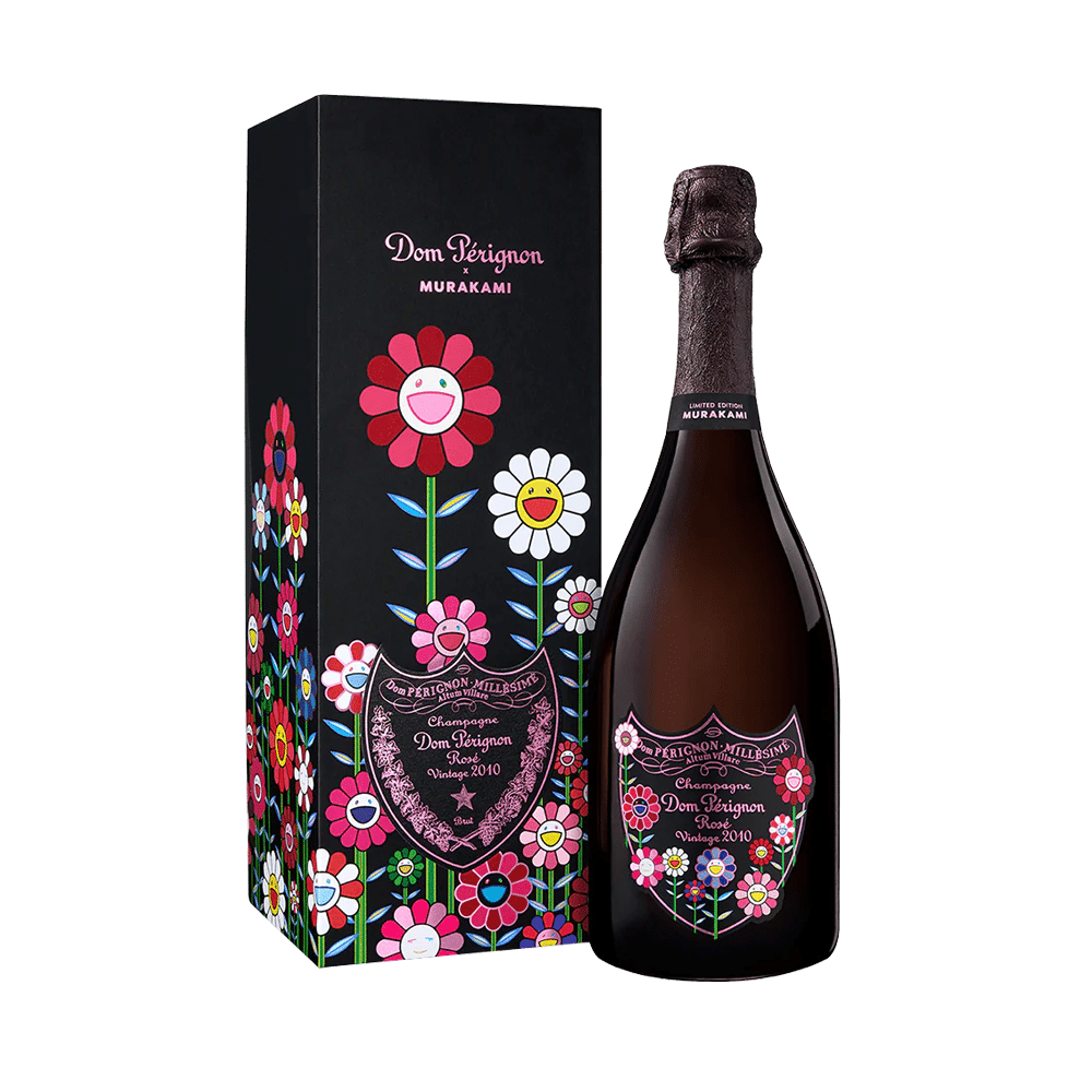 瓶身上,Dom Pérignon經典盾牌上的葡萄園意象,化為一片充滿奇想的花之景致;外盒包裝上,村上隆標誌性的繽紛花朵、環繞著Dom Pérignon盾牌綻放,歡騰而燦爛。