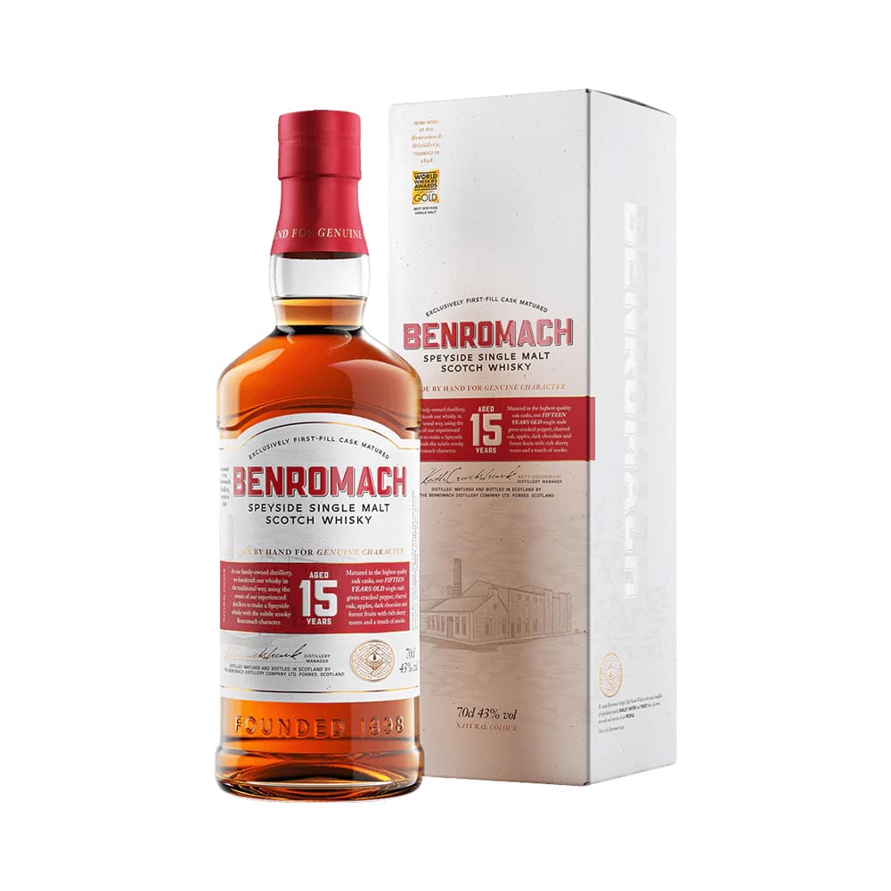 Benromach 15 Year Old 是蘇格蘭斯佩賽(Speyside)地區百樂門酒廠(Benromach)推出的單一麥芽威士忌。這款威士忌在首次填充的雪莉桶和波本桶中熟成15年,展現出豐富的雪莉風味和微妙的煙燻特色。其酒精濃度為43% ABV,並且未經冷過濾,保留了更多的風味層次。
